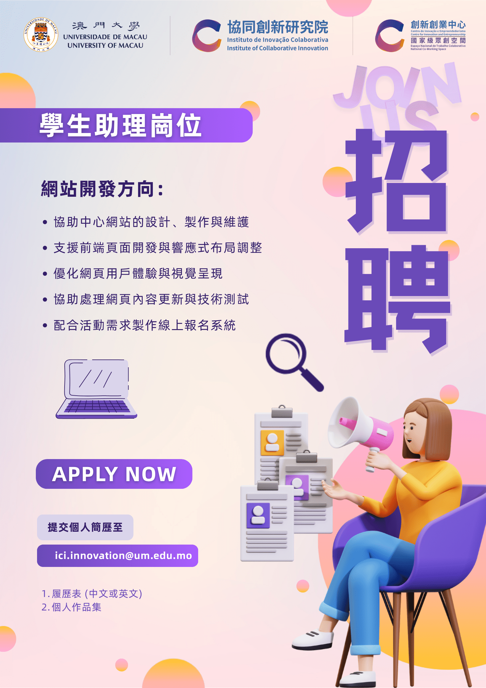 澳門大學創新創業中心(ICI-CIE)自2017年成立以來,致力於推動創新與創業,支持學生、教職員及校友將創意轉化為初創企業,促進人才、技術與產業的融合,現招募學生助理協助網站開發與維護事務,歡迎有相關經驗及相關背景的學生申請。