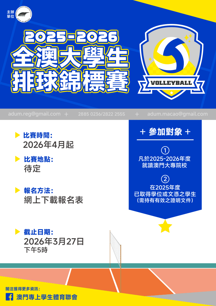 【體 . 比賽】: 「2025-2026全澳大學生排球錦標賽」將於4月18日在澳大綜合體育館訓練館 (N8) 開打