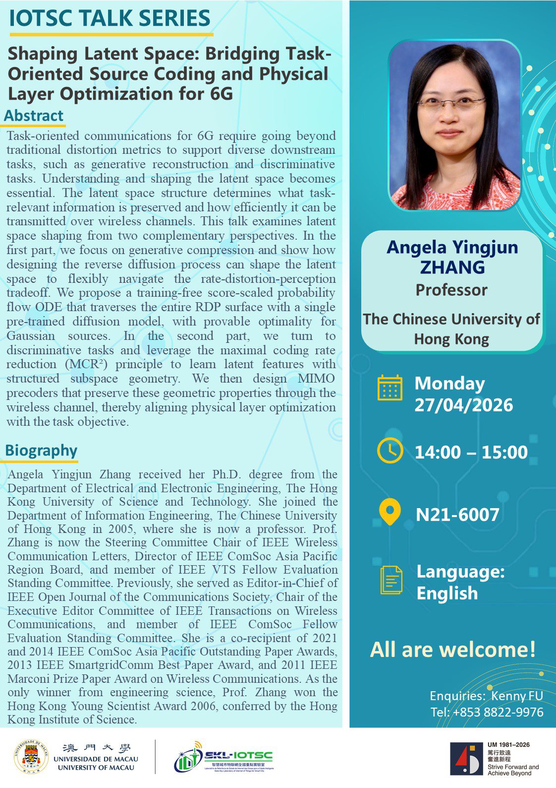 The State Key Laboratory of Internet of Things for Smart City would like to invite you to join our “IOTSC Talk Series” on 27/04/2026 (Monday). We are pleased to invite Prof. Angela Yingjun ZHANG from The Chinese University of Hong Kong as the speaker.