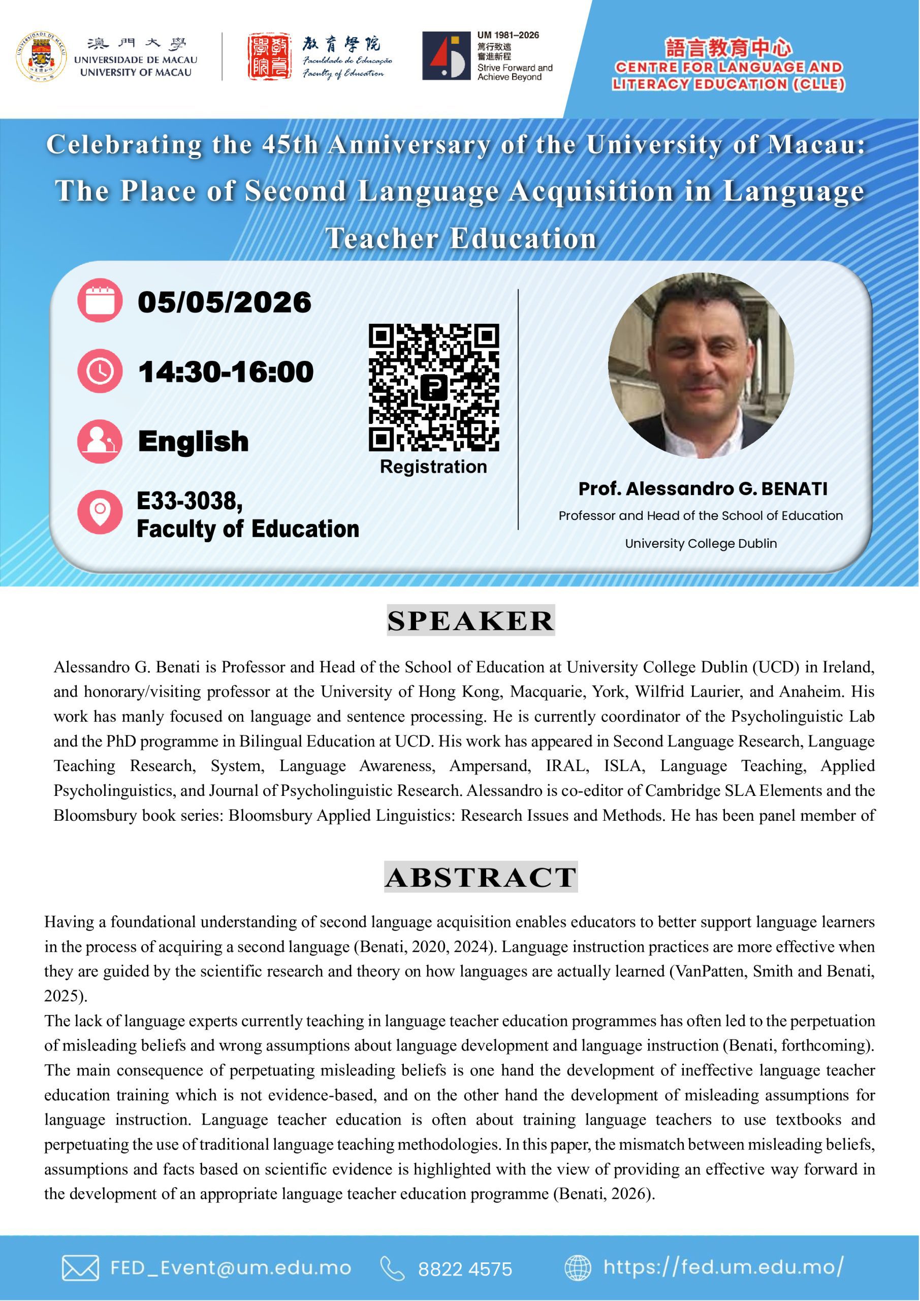 [FED] Celebrating the 45th Anniversary of the University of Macau: FED-CLLE Seminar “The Place of Second Language Acquisition in Language Teacher Education”