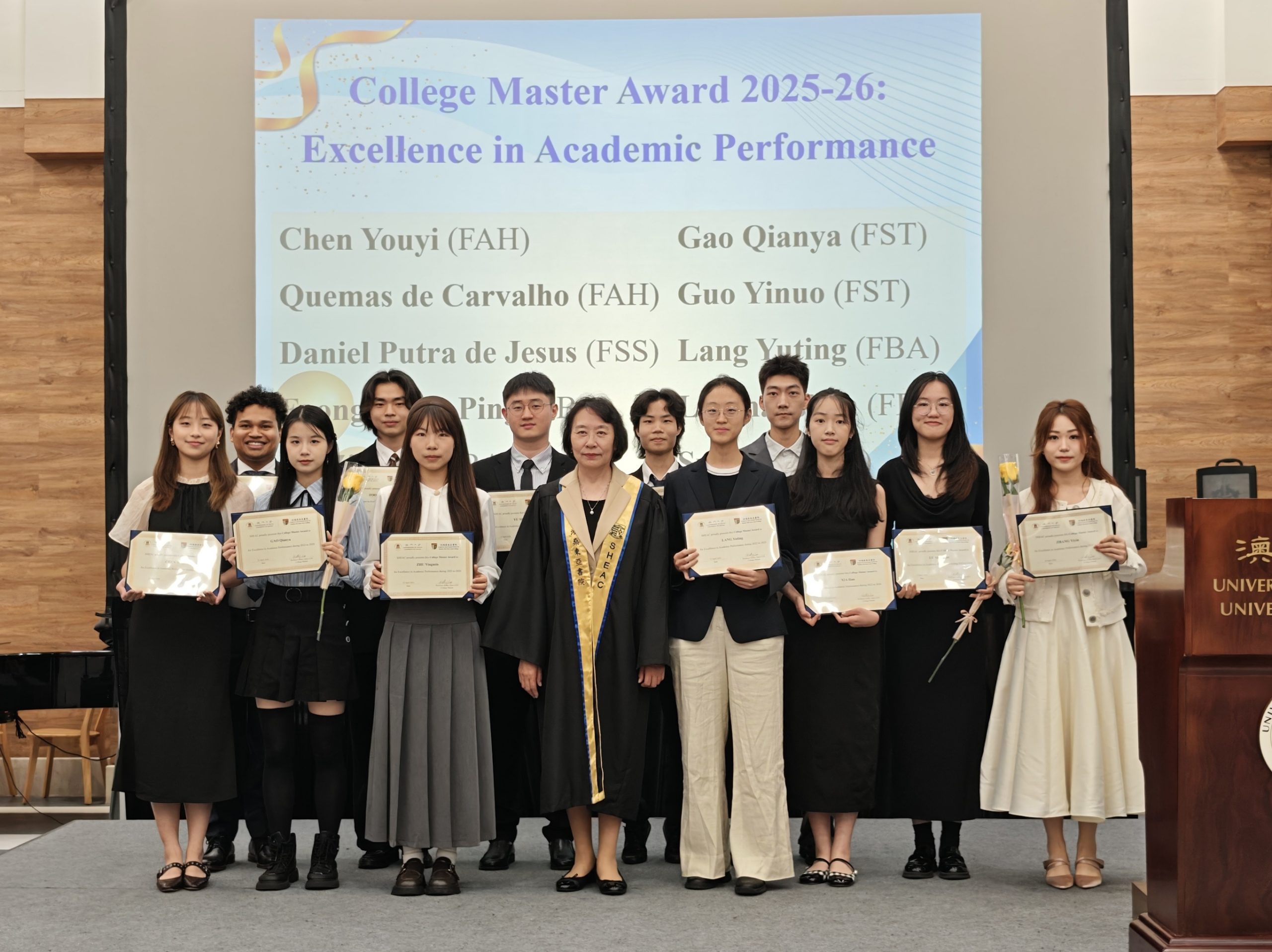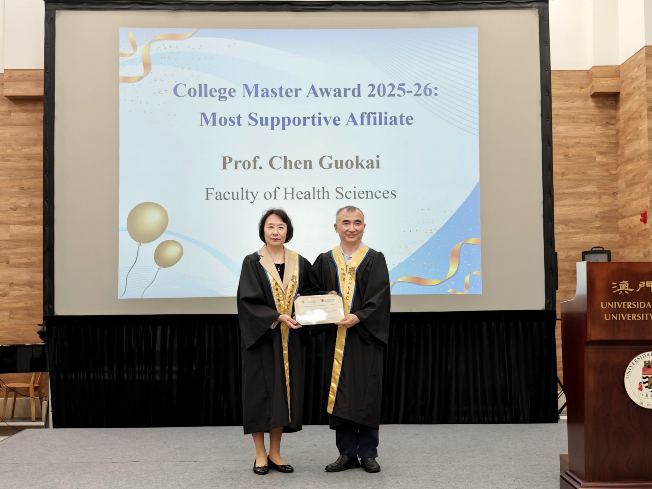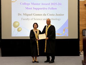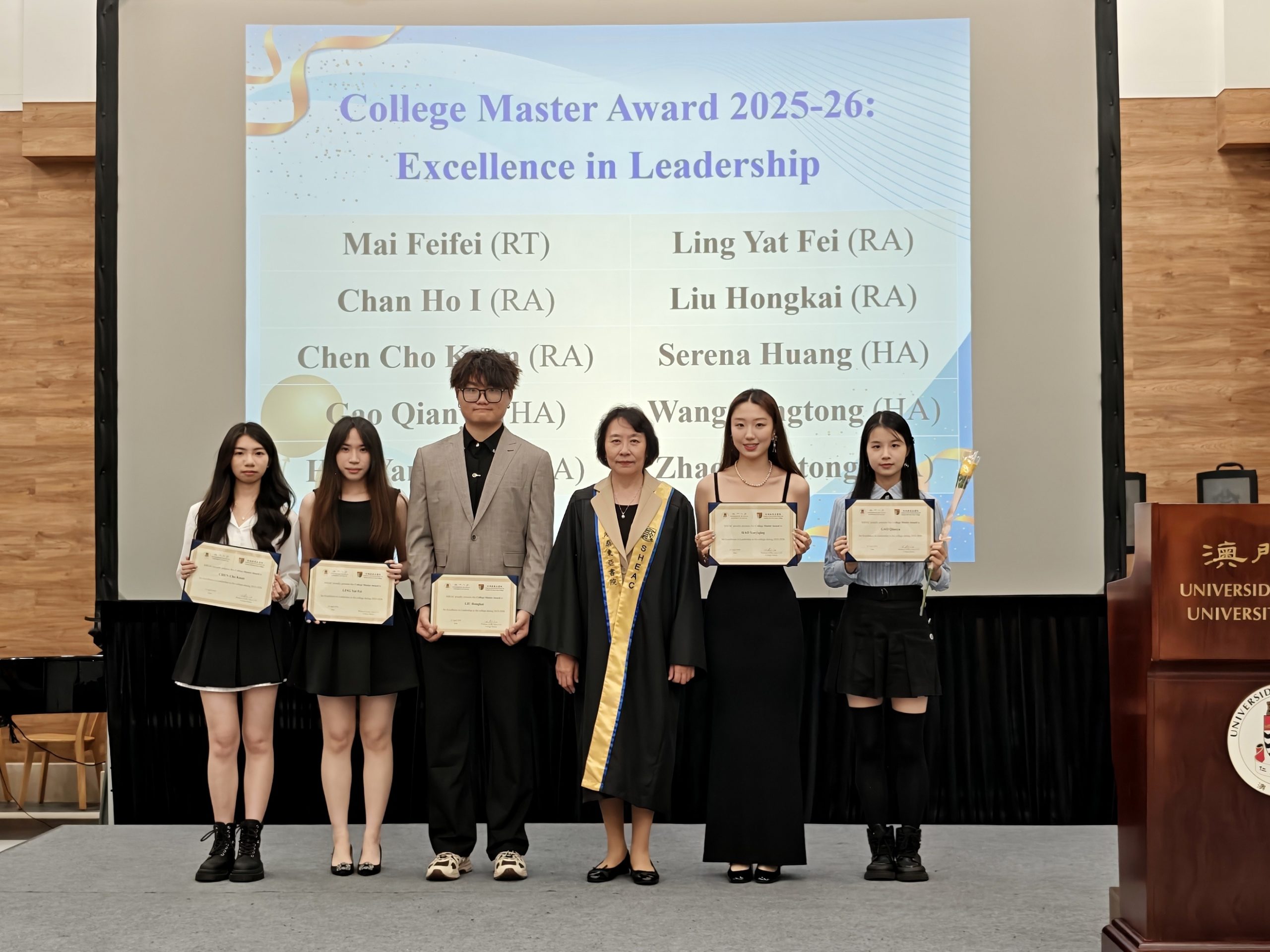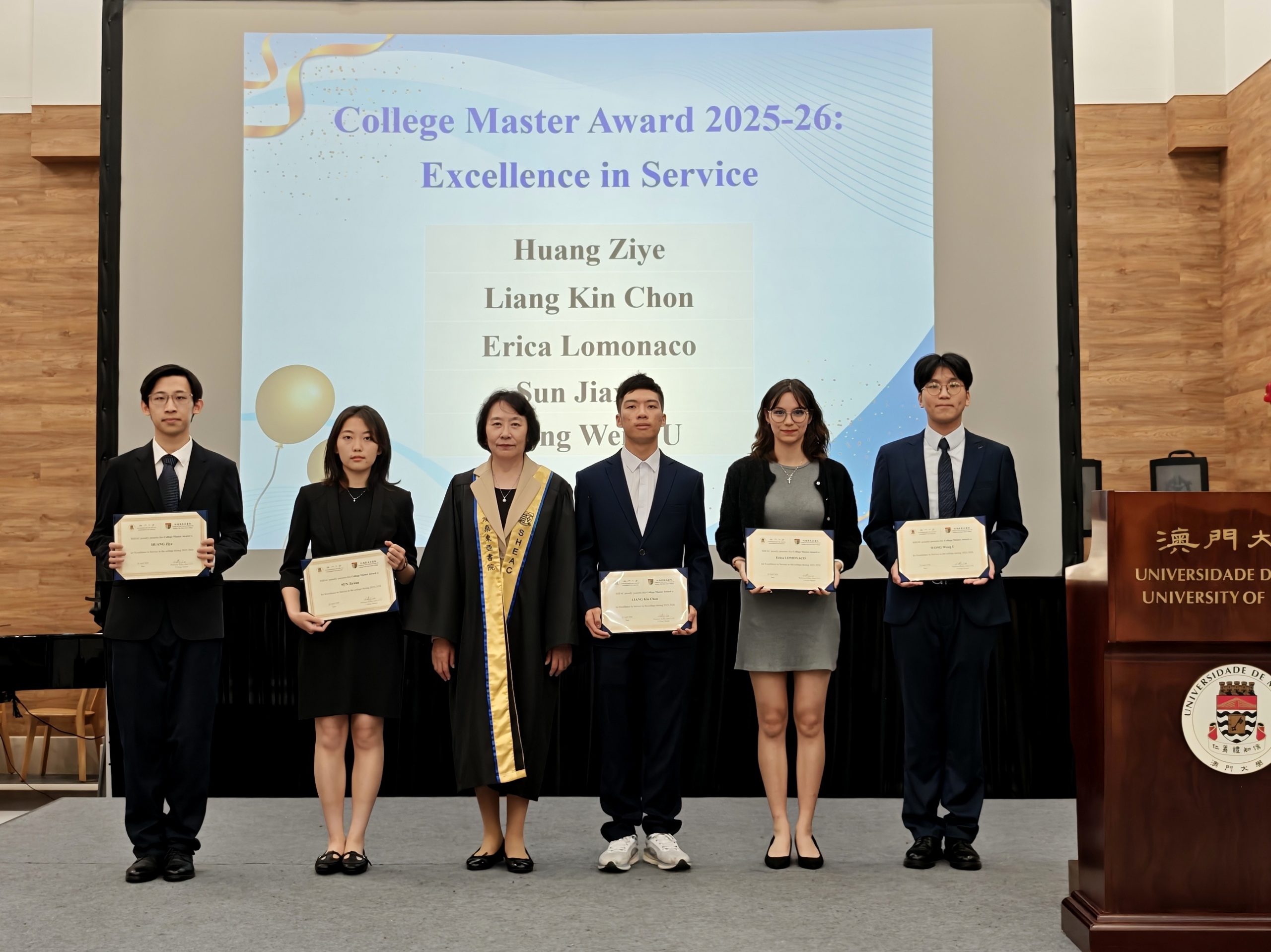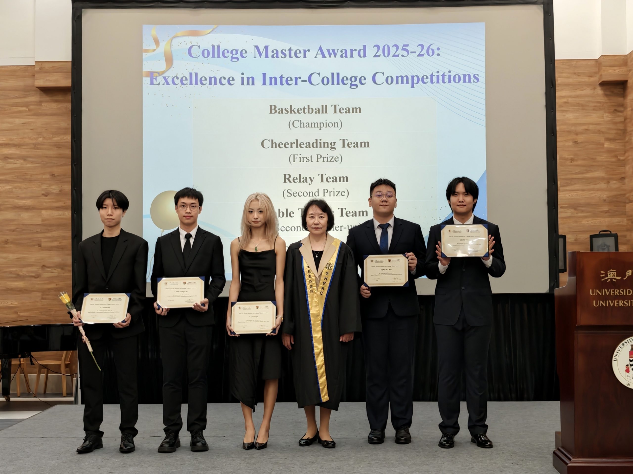 A simple but solemn ceremony presented College Master Awards for 2025-2026, including Most Supportive Affiliate to Prof. Chen Guokai (Faculty of Health Sciences), Most Supportive Fellow to Dr. Miguel Gomes da Costa Junior (Faculty of Science and Technology), and Most Outstanding Students of SHEAC to Mr. Daniel Putra De Jesus and Mr. Lin Chak Kai. Awards for Excellence in Academic Performance, Leadership, Service, and Inter-College Competitions were also presented.