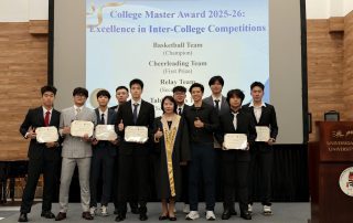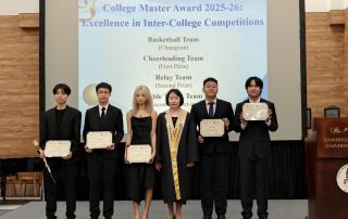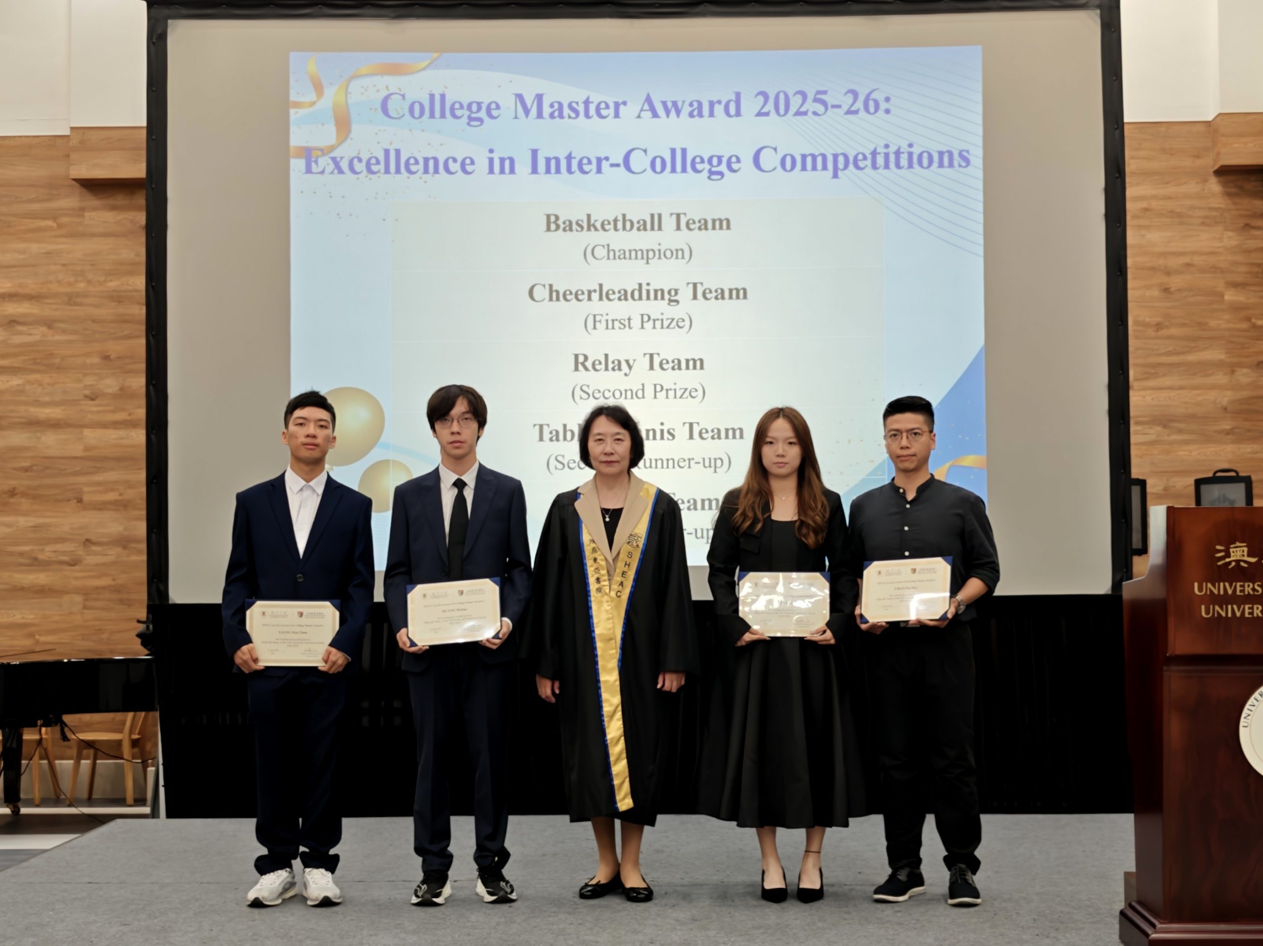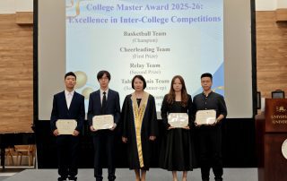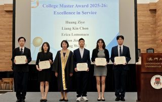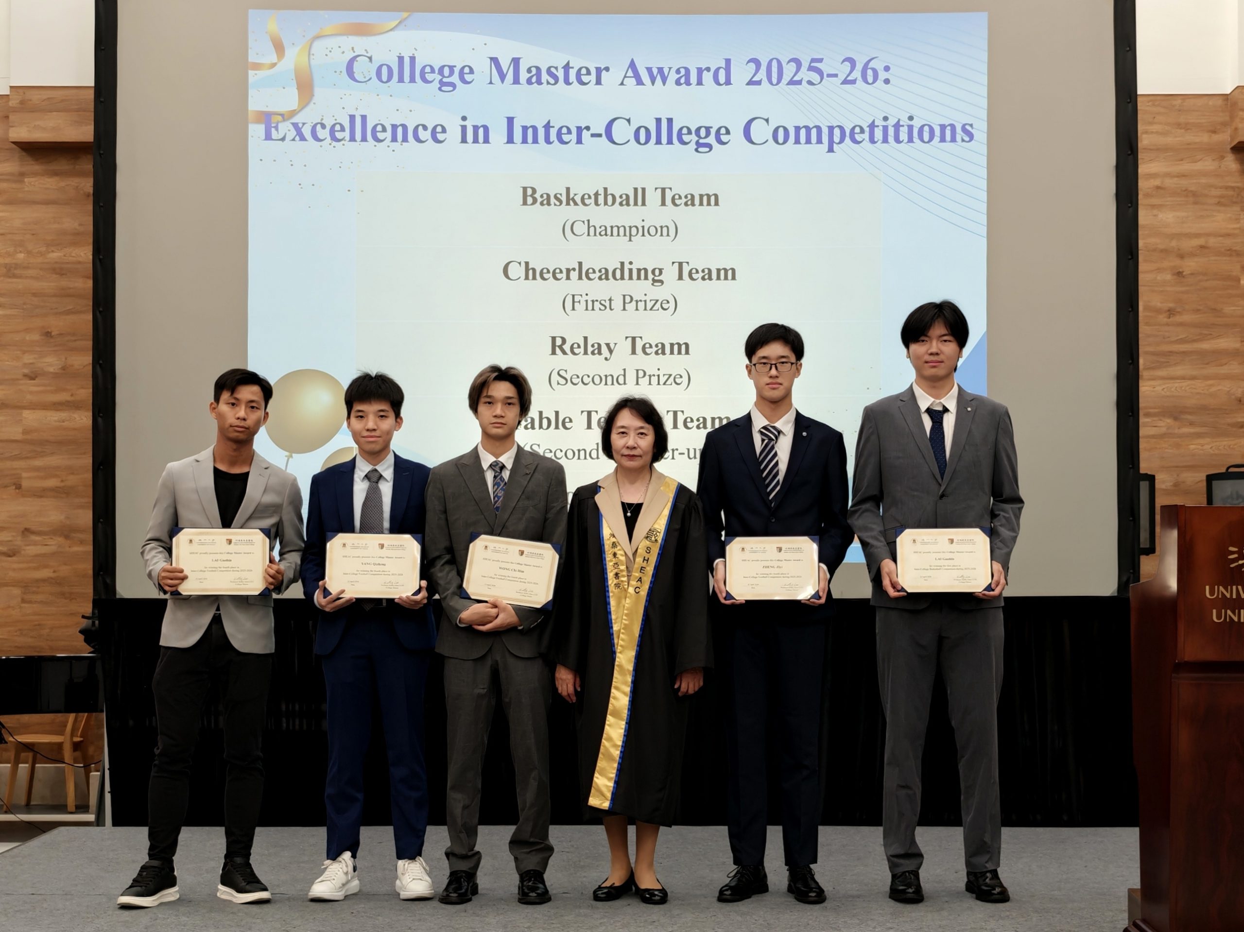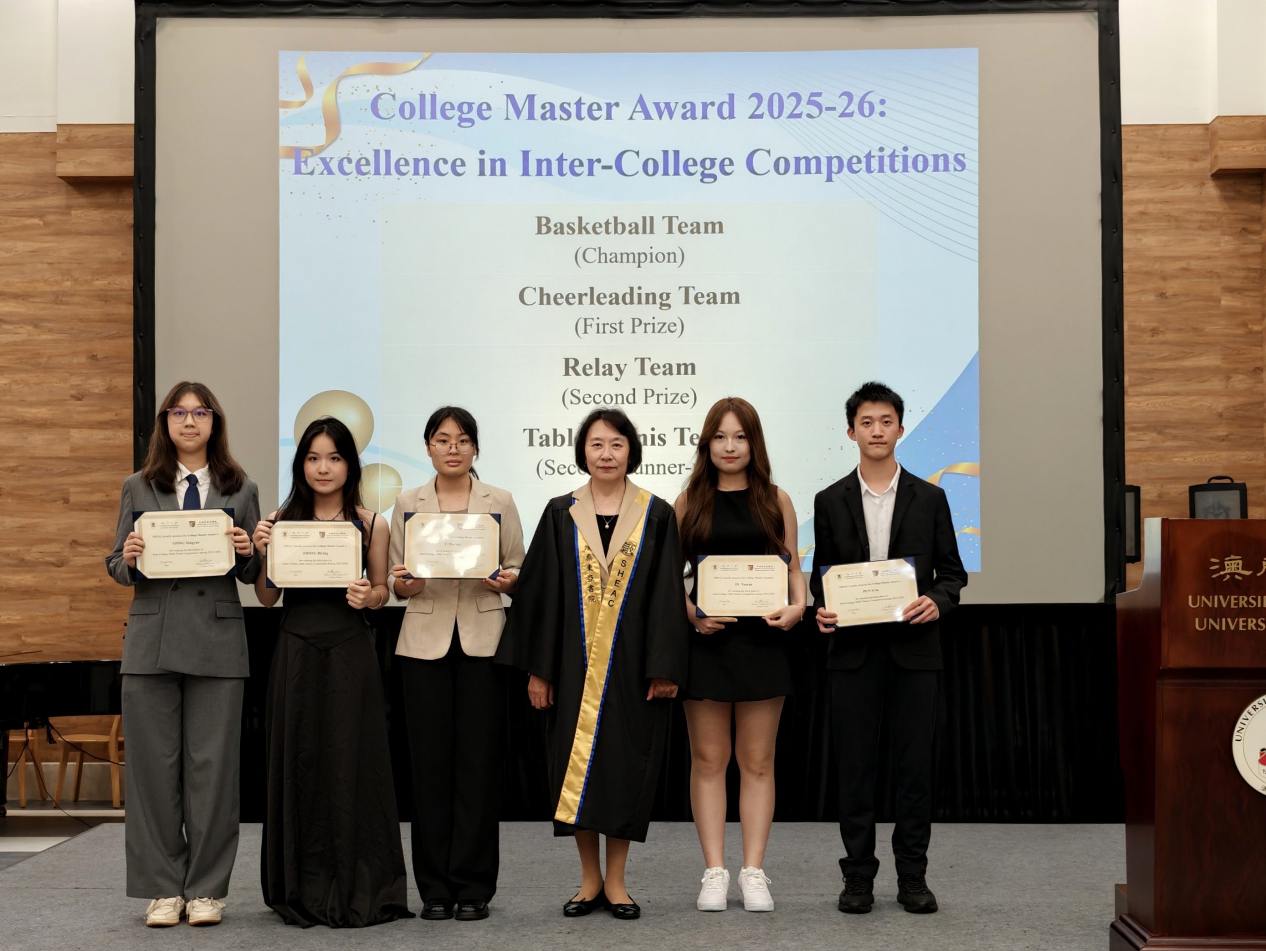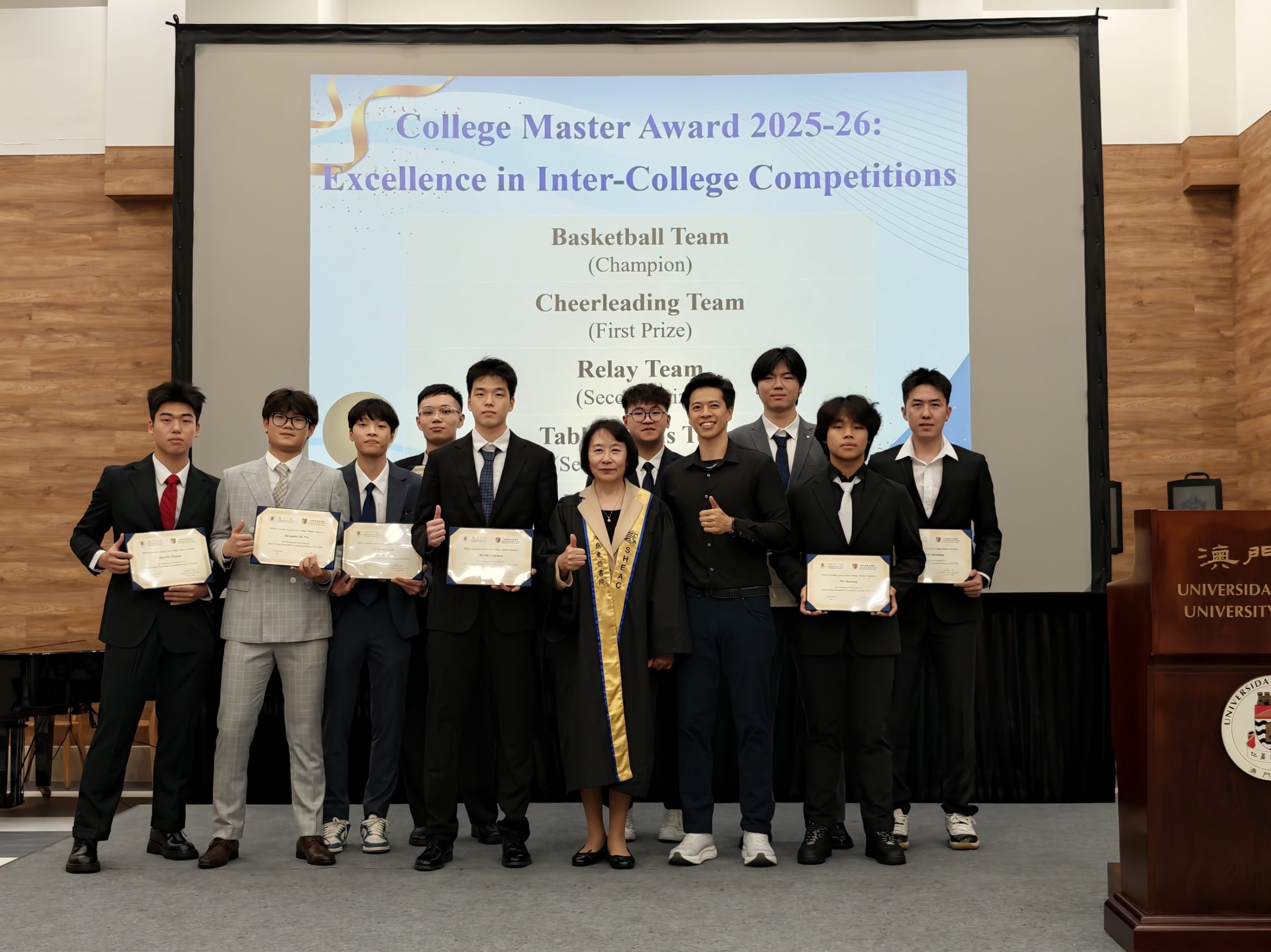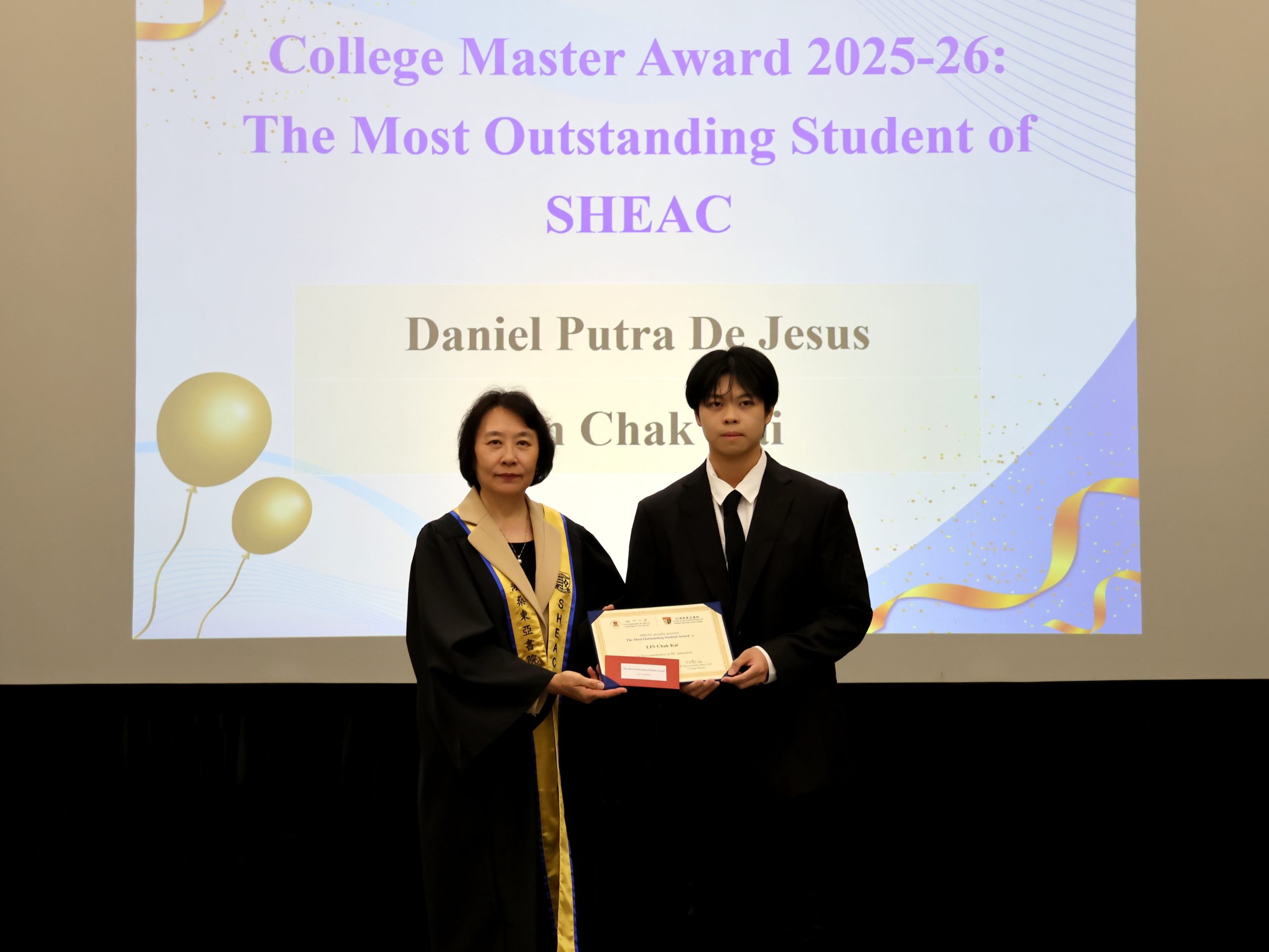 A simple but solemn ceremony presented College Master Awards for 2025-2026, including Most Supportive Affiliate to Prof. Chen Guokai (Faculty of Health Sciences), Most Supportive Fellow to Dr. Miguel Gomes da Costa Junior (Faculty of Science and Technology), and Most Outstanding Students of SHEAC to Mr. Daniel Putra De Jesus and Mr. Lin Chak Kai. Awards for Excellence in Academic Performance, Leadership, Service, and Inter-College Competitions were also presented.