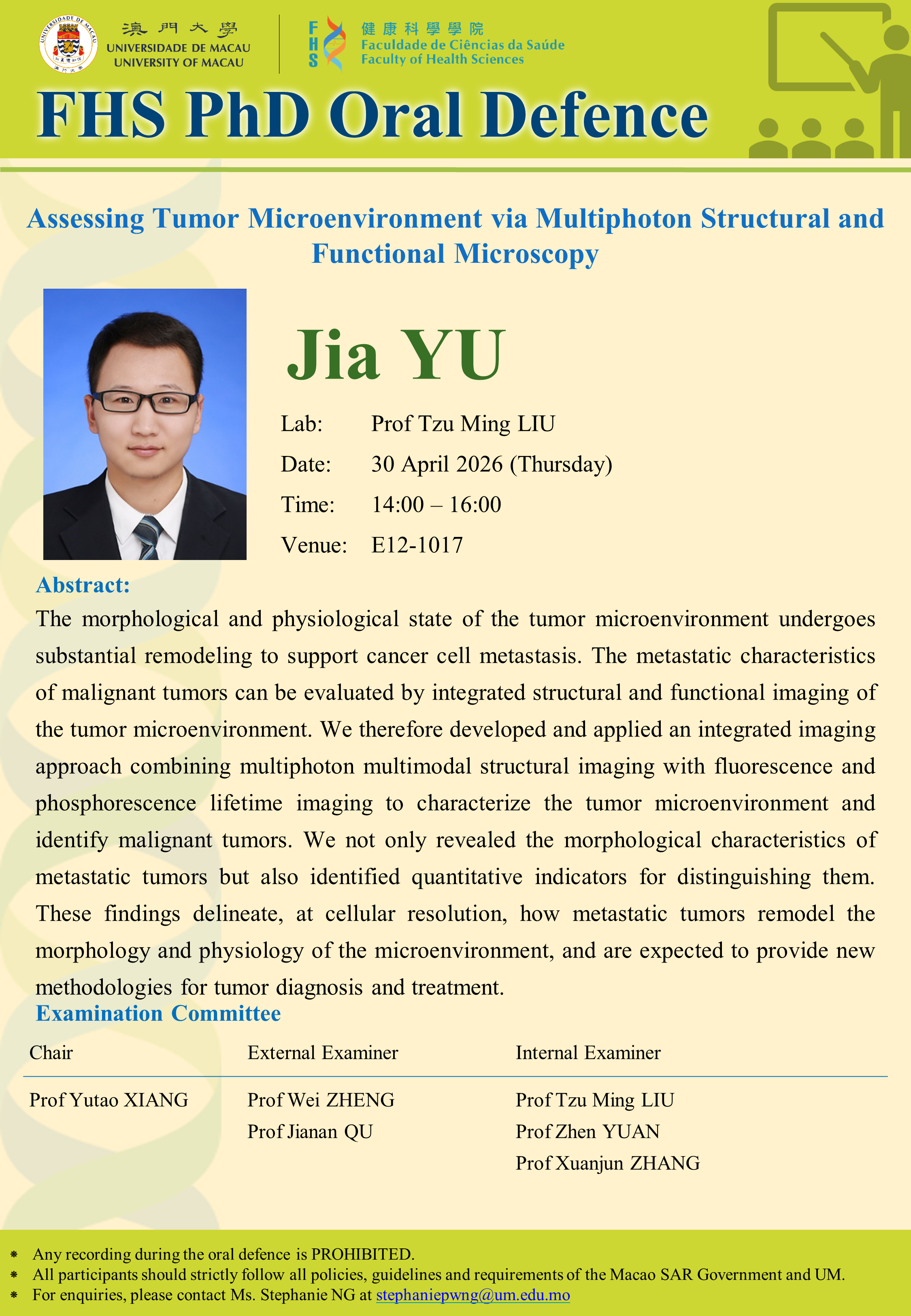 PhD Oral Defence in Faculty of Health Sciences, by Mr Jia YU on 30 April 2026 (Thursday)
