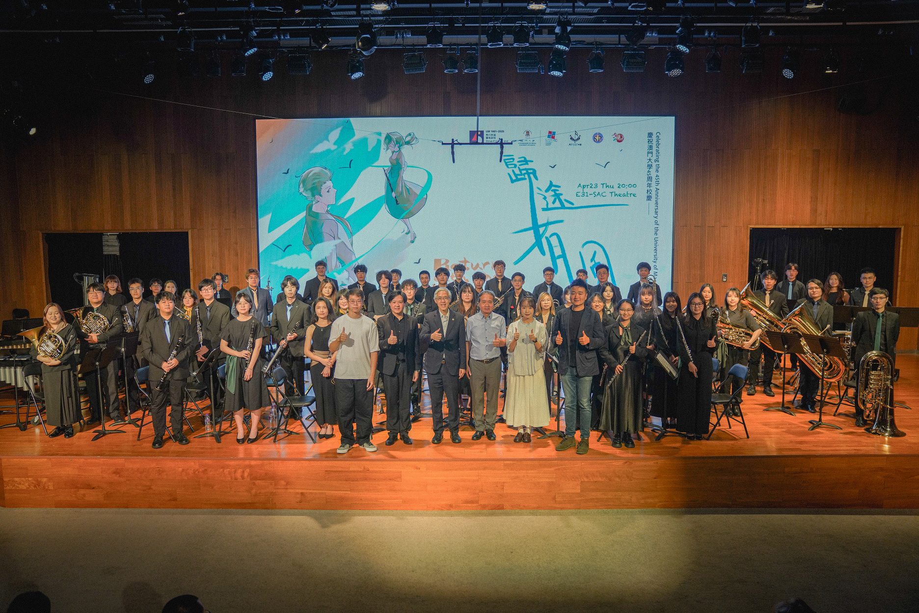 The University of Macau Symphonic Band (UMSB) successfully concluded its semester concert, “Return with the Winds”, at the E31 Student Activity Centre Theatre. This year’s performance held special significance as it commemorated the 45th Anniversary of the University of Macau, paying a breathtaking musical tribute to the institution’s legacy of nearly half a century.