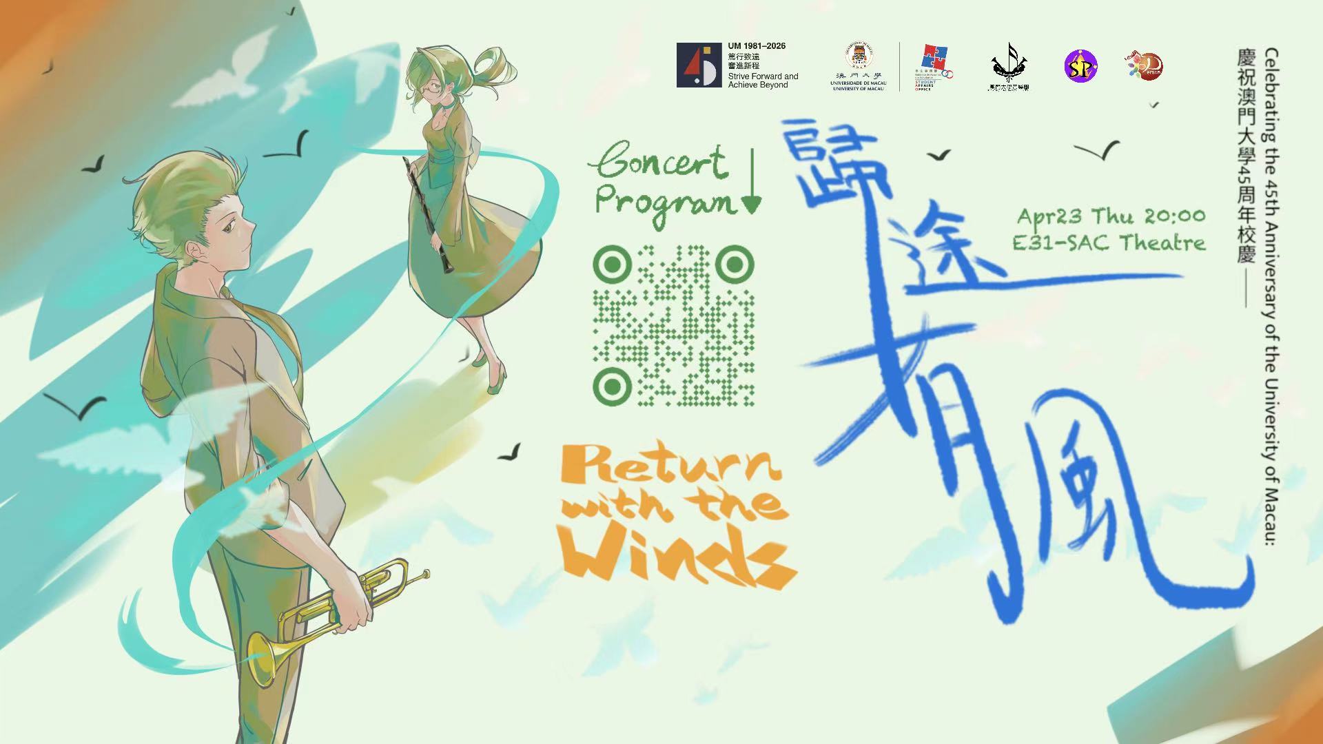 澳門大學管樂團(UMSB)學期音樂會《歸途有風》已於 E31 學生活動中心劇院圓滿落幕。適逢澳門大學建校 45 周年,這場演出不僅展示了樂團精湛的藝術水準,更以音樂為紐帶,為母校近半個世紀的輝煌歷程獻上深情讚歌。