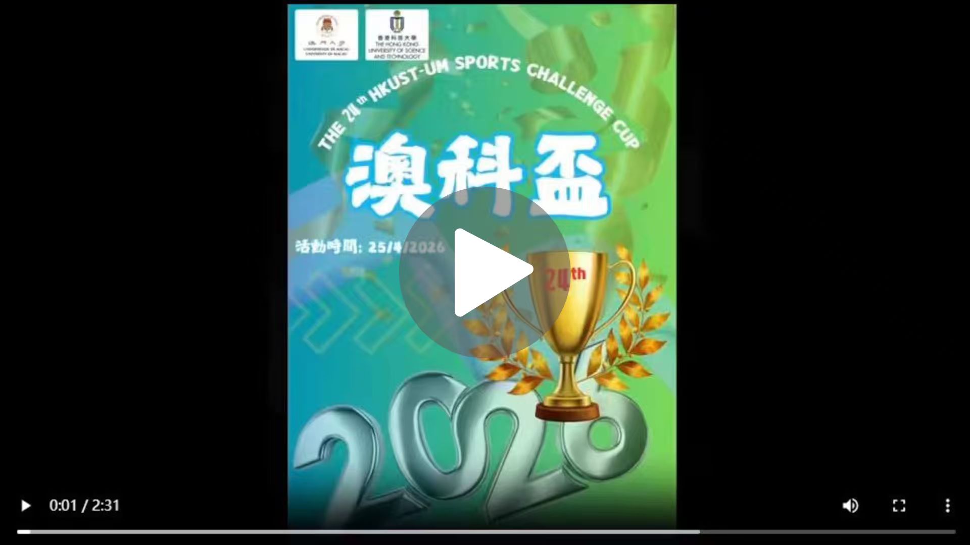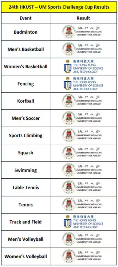 The HKUST-UM Sports Challenge Cup (澳科盃體育挑戰賽) has been a yearly event since 2000 and it promotes exchange of skills and friendship between students of University of Macau (UM) and Hong Kong University of Science and Technology (HKUST). We are so glad that the exchange activity hosted by UM on 25 Apr (Sat) this year.